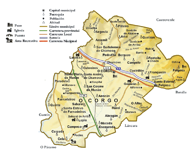 O Corgo está salpicado de igrexas románicas e mostras dunha rica arquitectura popular. O Corgo é un conxunto de 149 pequenos núcleos habitados por poucas familias pero inmersos en un paisaxe natural magnífico. É residencial dende sempre como o demostra a abundancia de Casas Grandes, hoxe convertidas en establecementos de turismo rural.